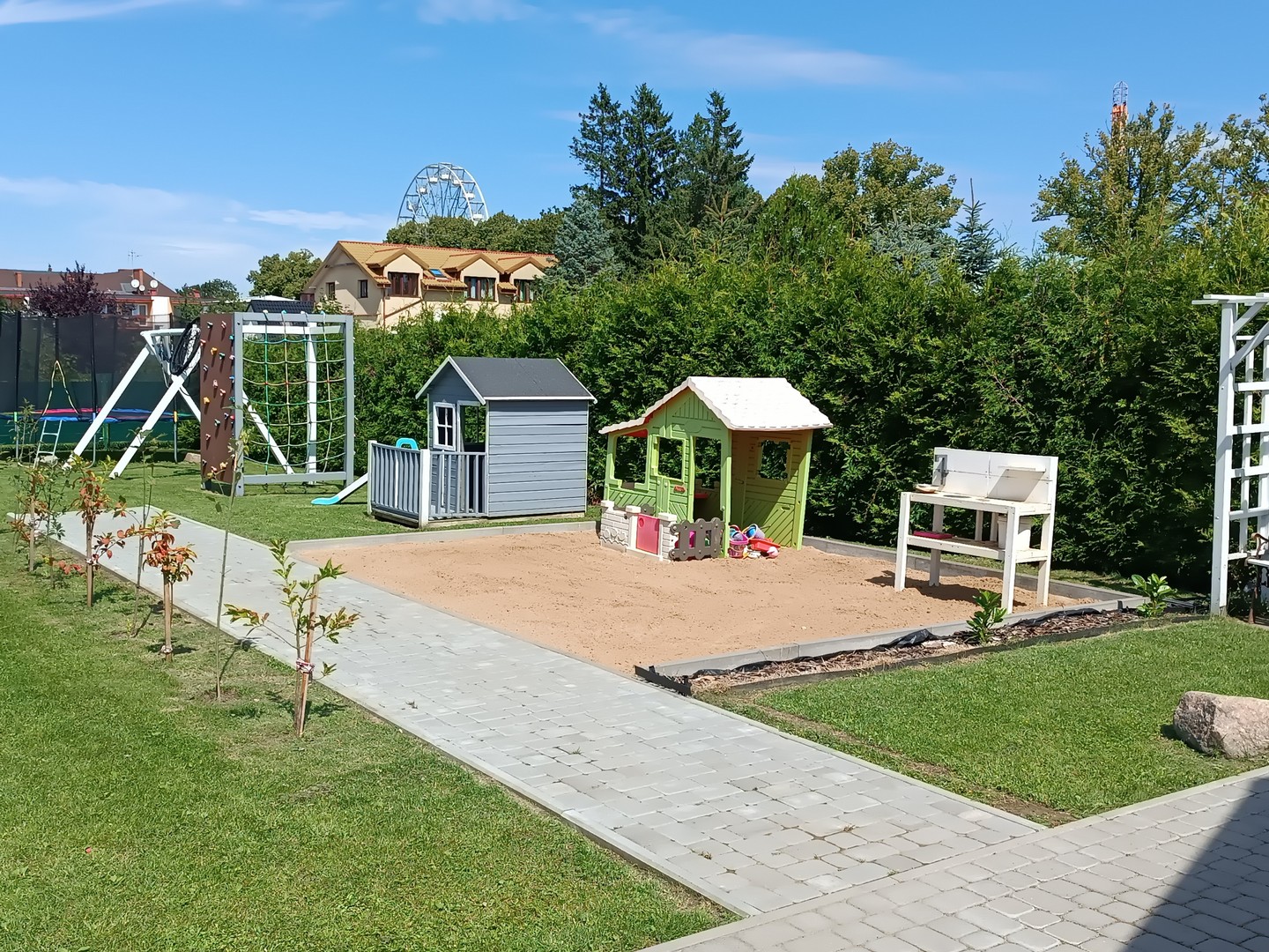 Na terenie ośrodka znajduje sie plac zabaw dla dzieci z trampoliną,boisko do gry w siatkówkę, sala zabaw
